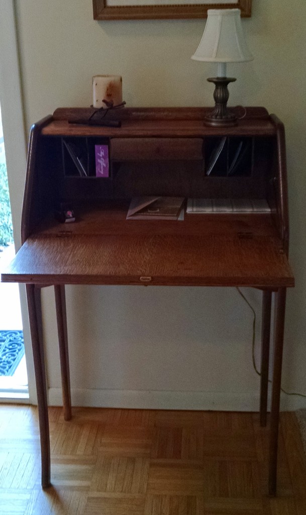 My Great-Grandmother’s secretary sits in the front hall of my home. It has had a varied history since it sat in Grandma Weaver’s home on Tireman in Detroit. Grandmother used it as a desk with its pigeon holes and two drawers — one inside and the large one beneath the desk. After Grandmother Weaver died in 1945, the desk went to my grandparents’ attic (her son, Lee’s) where it sat until 1956. Then, my parents borrowed the desk as my father was designing and building a room for my brother and I to share. He was building with the major furnishings built in– dressers inserted in the walls, a 12-foot bookcase next to the stairs, and two desks. My desk was the first as it was used at the short side of the stairs coming up to the room. He used my great grandmother’s desk as a model for the huge desk he created. Once he was done, my grandparents did not want the desk back so my parents relegated it to their basement. For a while it was ignored, then it was put into service as a shoe polishing station (the brushes fit nicely into the pigeon holes, the cloths in the inside drawer and everything else just inside the desk. My mother liked it because with the lid closed, the mess was out of sight. And it WAS A MESS! I think more liquid shoe dye ended up on the inside of the desk than ever hit all of the shoes that were ever polished.