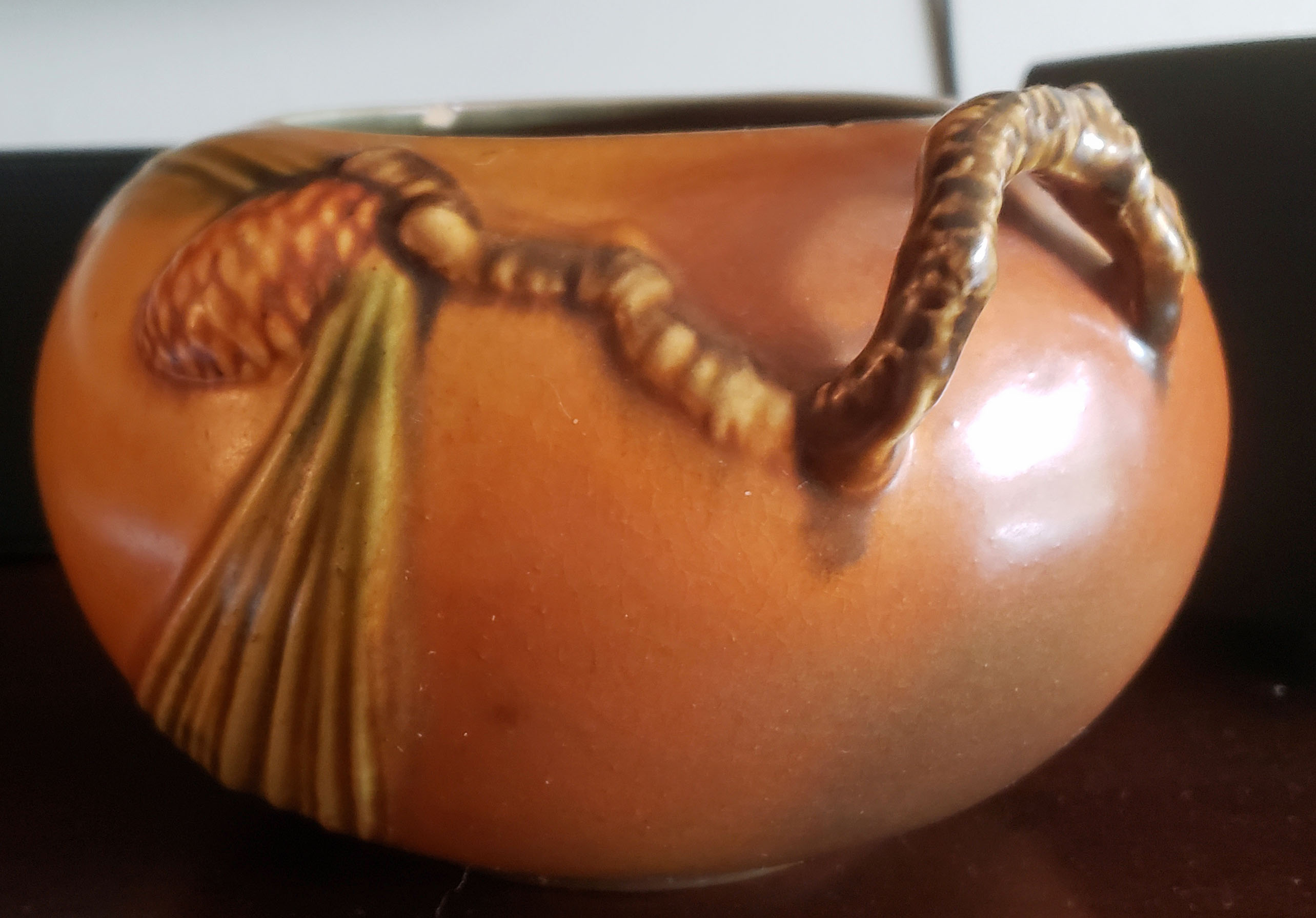 I was surprised to see it in the “stuff” that was at my parents’ home when I was preparing the items for an estate sale prior to selling the house itself. I tagged as not part of the sale. The people handling the sale wanted me to keep a number of other pieces that they thought were of value — a Red Wing vase plus some other items. But, when you are already living in a fully furnished home, there is only so many things you can justify keeping. So, the vases: gone; the Roseville Pottery: save.
