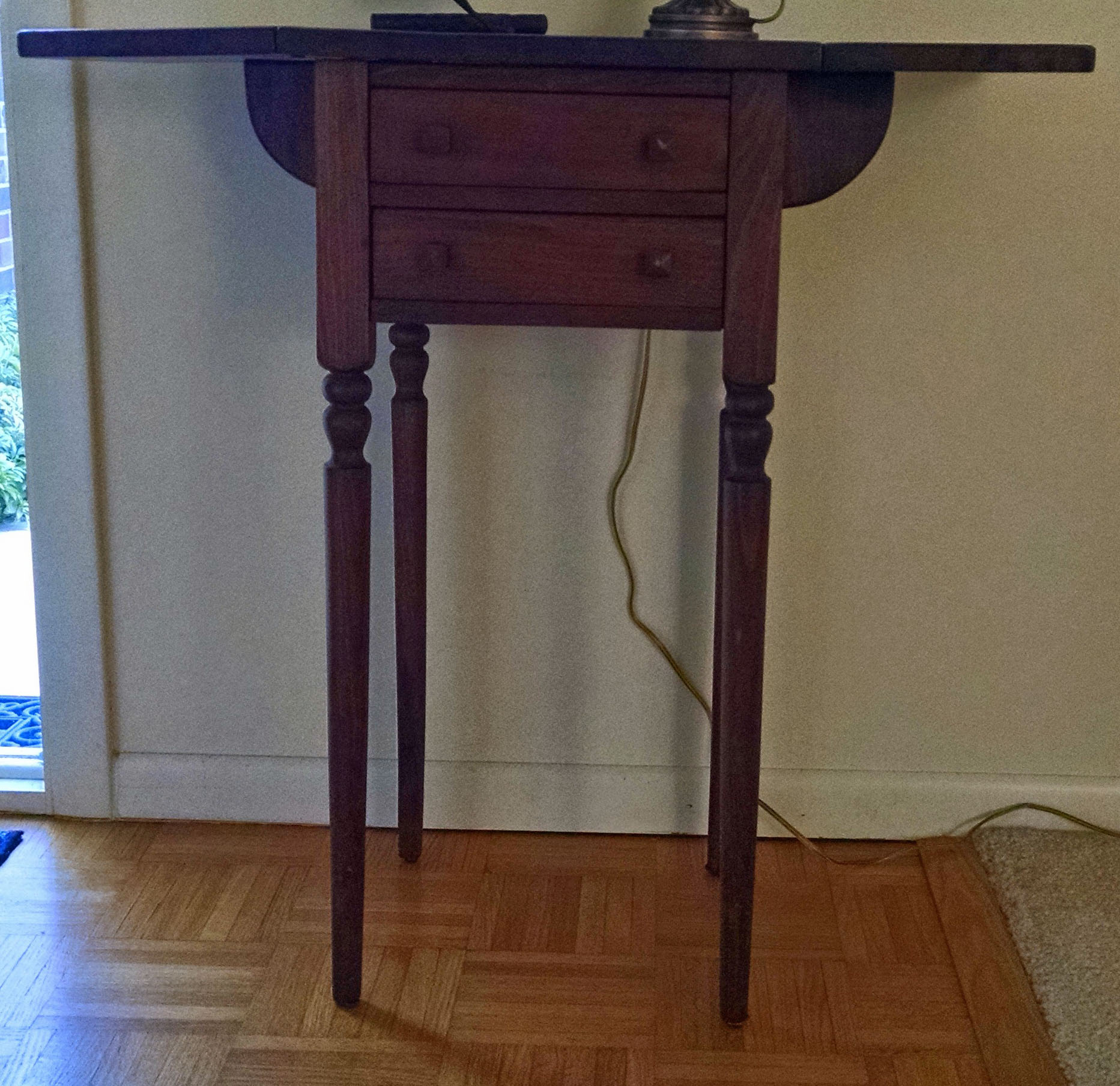 Now, when my mother rescued this little table from the sale at my grandparents’ home during the clean out as my grandmother was moving to an apartment after selling the 1929 purchased home. she asked my cousin to refinish it. The table is now in the finished state, with both leaves extended and held up by the wooden supports that are hinged and fold out of the way when the drop leaves are in their down position.