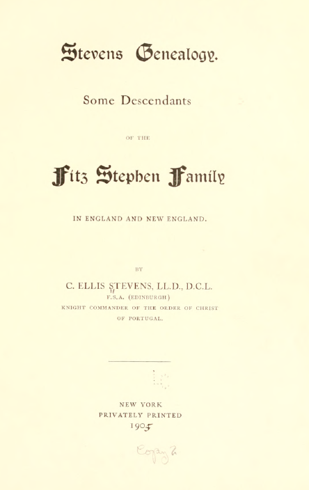 The book on the Lee family pointed me to this book on the Stevens Genealogy – Some Descendants of the Fitz Stephen Family in England and New England by C. Ellis Stevens, 1905